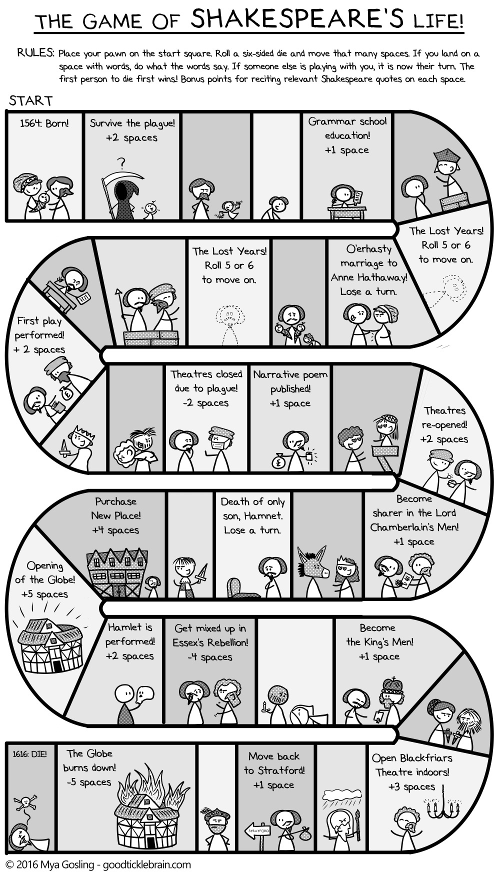 Continuing our epic journey towards Shakespeare’s 400th death anniversary on Saturday, here is a handy-dandy board game that allows you to relive all the exciting ups and downs of this master playwright’s eventful life!